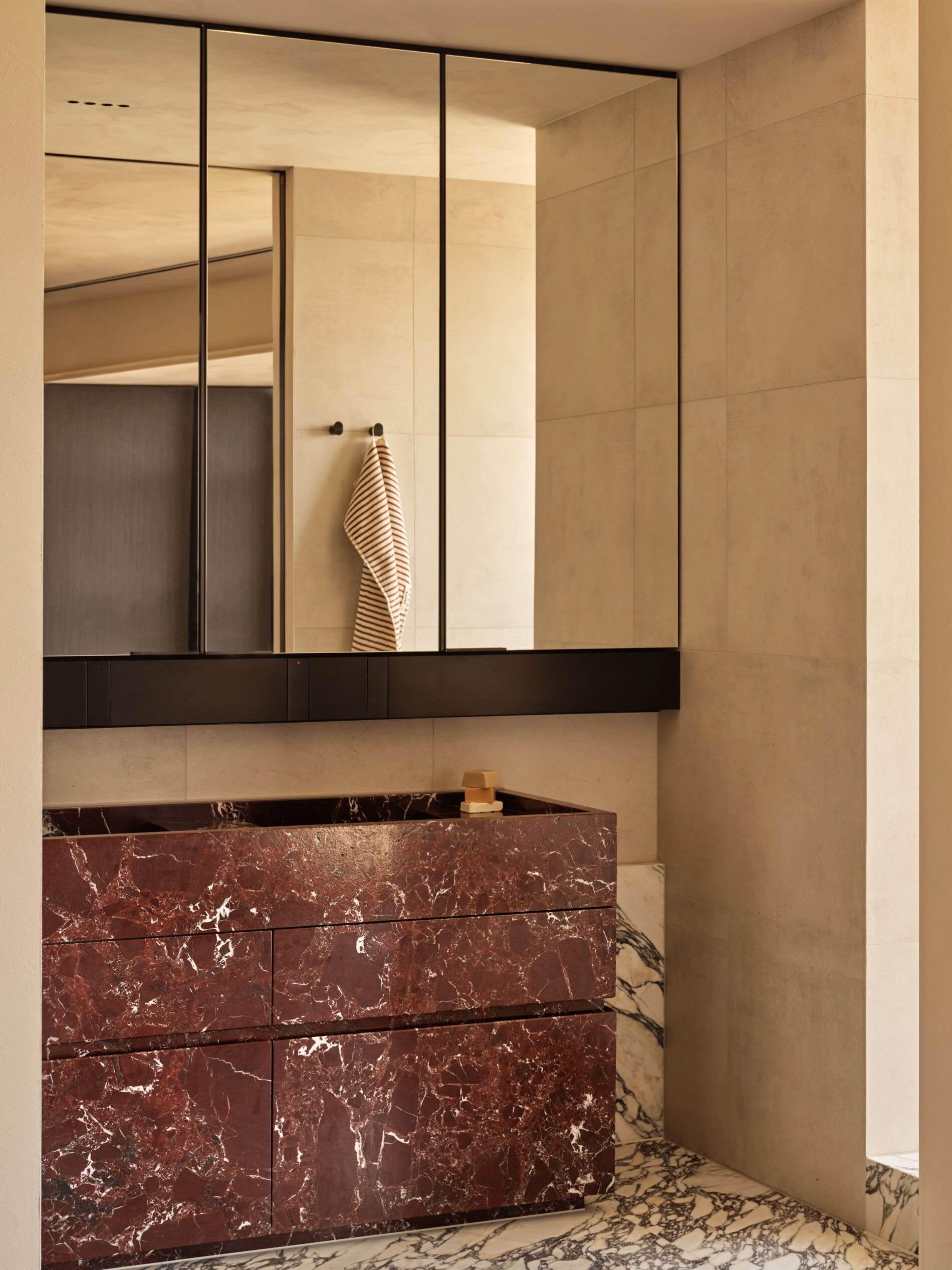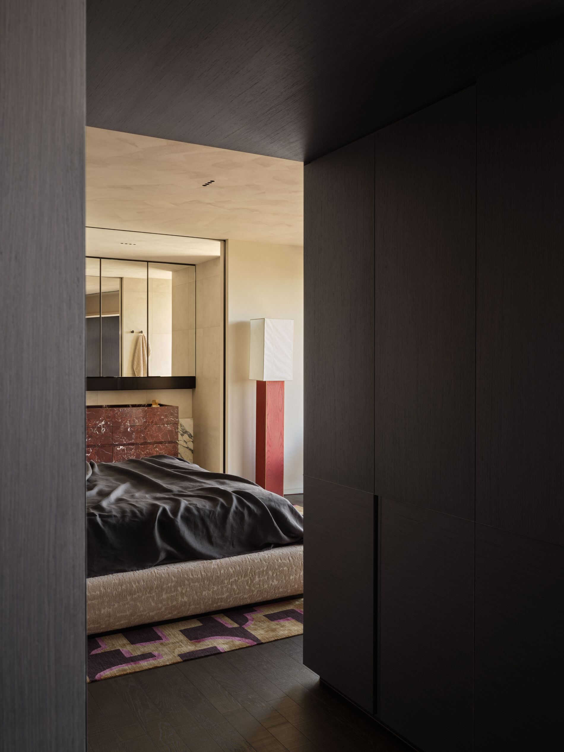 The apartment’s blend of iconic, contemporary and local pieces cultivates a collected sensibility, enhanced by bespoke elements designed in-house – including the main bed, which features a Calacatta Viola marble plinth resting on upholstered panels, finished with integrated metal detailing and reading lamps. Every gesture—material, structural, and spatial—works in concert to deliver an immersive apartment, marrying visual impact with enduring comfort and clarity.